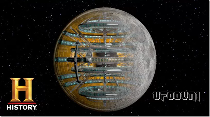 A Lua consistiria, portanto, de uma casca interna semelhante a um casco e uma concha exterior feita de rochosa metálica. Por razões desconhecidas, a “Espaçonave Lua” foi então colocada em órbita em torno da Terra.